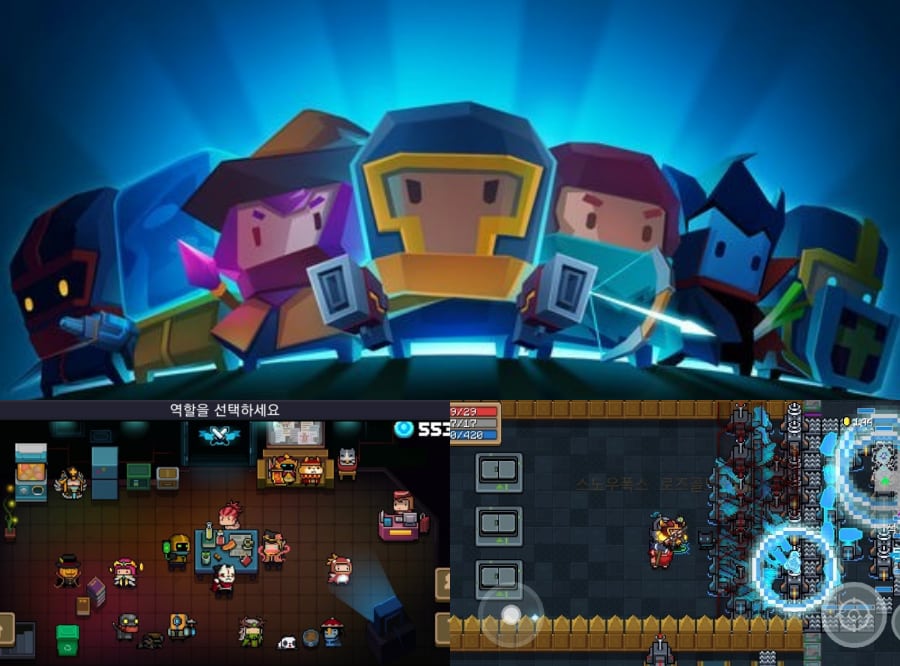 게임소개: 그동안 해보거나 봐왔던 로그라이크 게임과 매우 유사합니다. 캐릭터는 빨강이 체력 회색은 방어막 파란색은 코스트를 가지고 있으며 캐릭터마다 고유하게 가지고 있는 스킬 기존 스텟이 다릅니다. 일반몹을 계속 잡아나가면서 무기도 얻고 패시브도 찍고 하면서 보스를 잡는다 기본 틀은 이거죠. 그리고 여기서부터가 다른 로그라이크 겜들과 다르다고 할 수 있는 부분인데 보통 컴퓨터 로그라이크 게임 같은 경우 방향 조작 공격 에임 조준 3가지 동작을 하죠 하지만 모바일 게임 특성상 이렇게 3가지 동작을 모두 하는 건 어렵습니다. 그렇기에 소울나이트는 에임이 자동 조준입니다. 에임 자동 조준이라 쉽다고 생각할 수 있습니다. 하지만 말로 표현하기 어렵지만 생각보다 어려운 게임입니다.