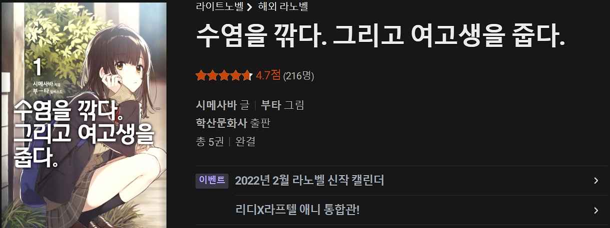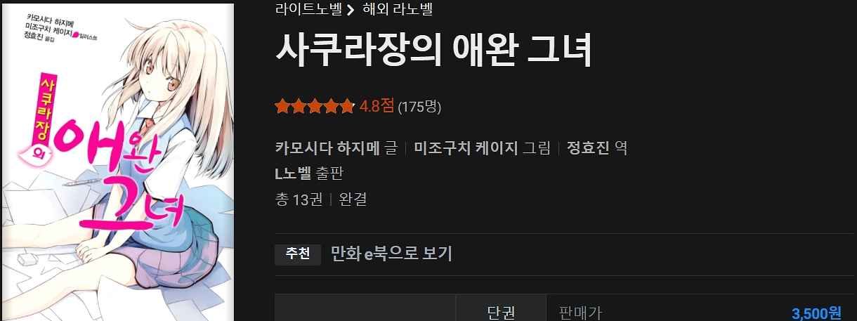 평가: 러브 코미디&치유물 결합된 라이트노벨인데, 사실 러브 코미디보다 드라마적인 전개와 감동이 결합된 로맨스 같습니다. 솔직히 문체도 라이트노벨 같지 않고 현대 장편소설 같아요. 그리고 치유물이라 하는 것도 포근 안락 일상 느낌은 아니고 등장인물의 무거운 관계, 과거에 기반한 것을 서로의 정으로 치유해주는 느낌이라 진지한 전개를 별로 좋아하지 않으면 추천하지 않습니다.