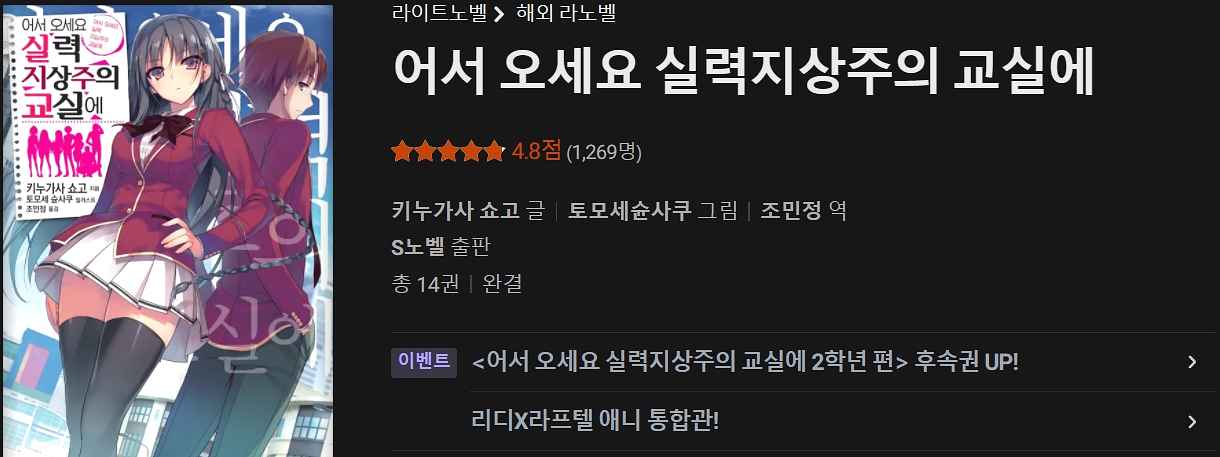 줄거리: 희망하는 학교, 회사에 거의 100% 들어갈 수 있는 일본 굴지의 명문고 고도 육성 고등학교. 최신 시설을 사용할 수 있음은 물론 매달 십만 엔의 가치가 있는 포인트가 지급되며 두발 자유, 개인 소지품도 허용! 그야말로 낙원이나 다름없는 학교. 하지만 사실 그 정체는 우수한 학생만 좋은 대우를 받는 실력지상주의 학교였다. 어떤 이유로 입시 시험을 대충 친 남자 주인공 아야노코지 키요타카는 불량품이 모인 곳이라는 야유를 받는 최하위 D반에 배정받는다. 그리고 성적은 우수하지만 성격이 초 난감한 미소녀 호리키타 스즈네, 다정하고 배려심 많은 천사 같은 소녀 쿠시다 키쿄 등과의 만남으로 키요타카의 상황도 급변하게 되는데.. 대인기 크리에이터 콤비가 선사하는 새로운 학원 묵시록!