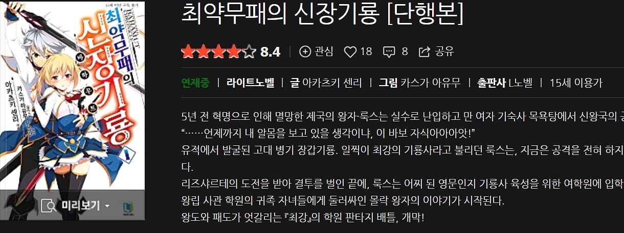 평가: 이세계물중 이정도면 충분히 읽을만하다 생각합니다. 주인공이 강하다 보니 전투보다는 여행기 같은 느낌입니다. TS물 중에서 거부감 없이 접할수 있는편이기도 하구요. 편하게 보기 좋은 라노벨이라 보시면 되겠네요.