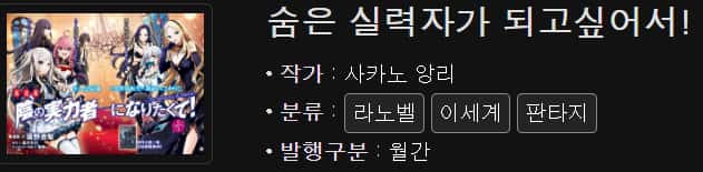 평가: 이세계 전생물이지만 세계관도 독특하고 스테이터스 창이나 현대 지식 활용 장면이 아예 나오질 않습니다. 악역영애물에서 아이디어를 얻어 스토리가 진행되는 것도 흥미롭고 전개가 빠르고 답답한 장면이 없어요. 다만 등장인물들이 너무 많고 이름을 외우기 어려워서 주인공 일행 말고는 누구에 대해서 말하는지 통 이해하기가 어렵네요.