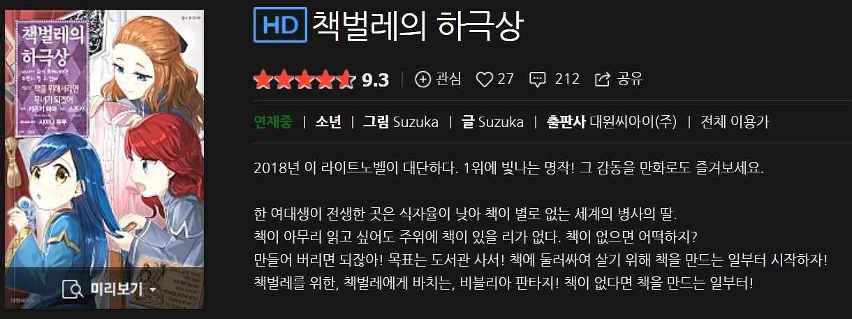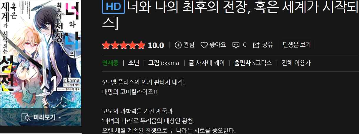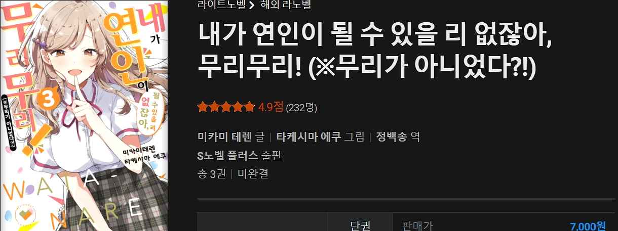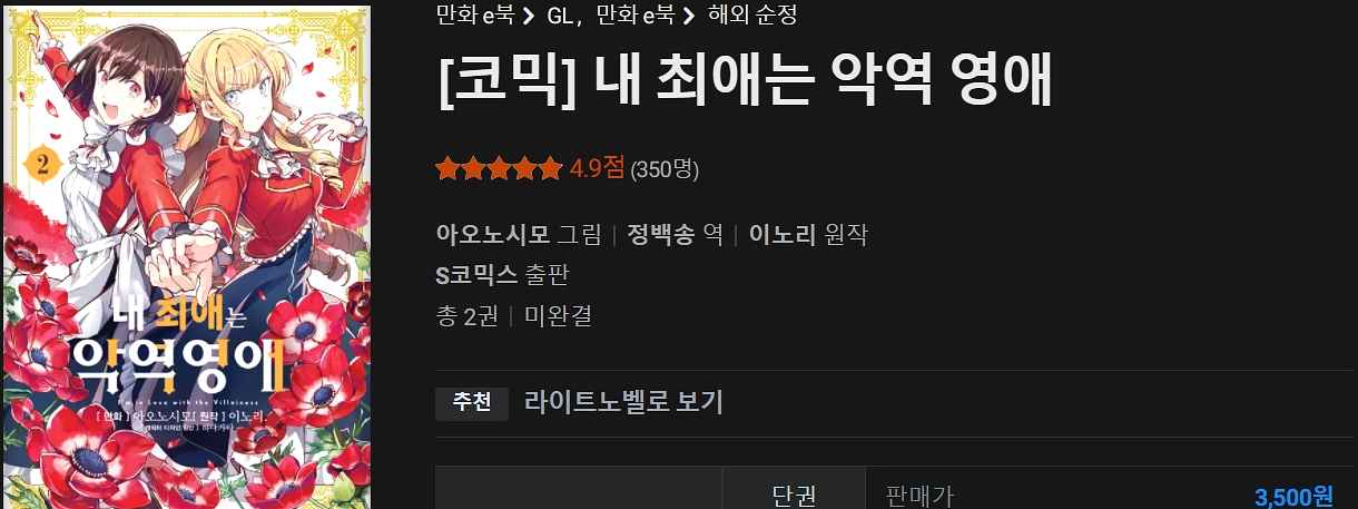 평가: 백합은 좋은데 번역이 진짜 보기 힘들어요. 흔히 말하는 라노벨 남주 같아서 괴롭고 번역자 진짜 궁금해지네요. 이렇게까지 직역을 할 일인지 너무 답답 하지만 백합이니까 참고 봅니다.