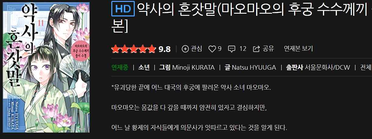 평가: 책벌레의 하극상을 읽다가 추천받은 작품이라서 이번에 이북 올라온 거 보고 바로 구입했습니다. 중국풍의 세계관, 잘 짜인 등장인물들, 흥미로운 추리, 사건과 사건이 이어지는 떡밥들의 연계성. 다들 왜 추천하시는지 알겠네요.