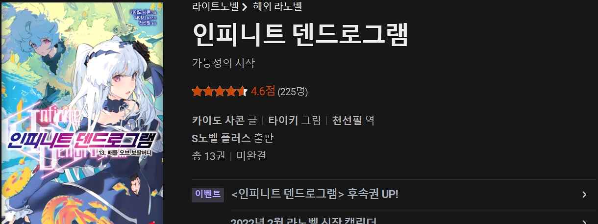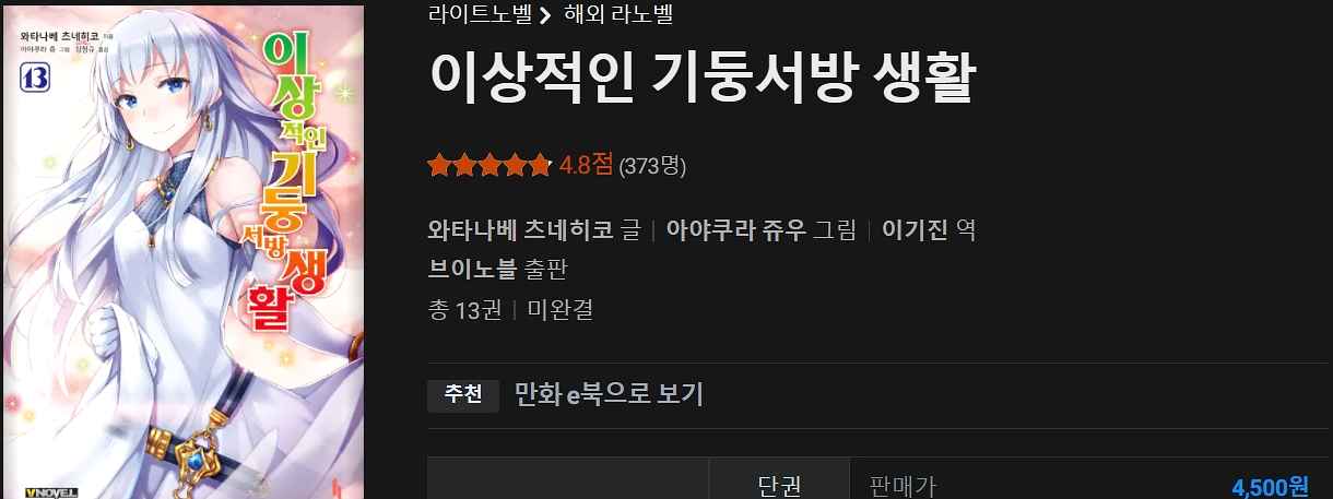 평가: 라노벨 중에서는 볼 만한 편이라고 생각함. 근데 번역이 거슬리는 것도 있고 내용 진행이 굉장히 느린 편. 뭐 하나 정해지면 계속 딴 길로 새는데 그다지 중요한 내용인 것도 아니고 굳이 질질 끌 일도 아닌데 그러고 있음. 작가 본인이 문장을 어떻게든 늘려서 쓰는 것도 있음. 자극적이지 않지만 결코 지루하지도 않은 작품.