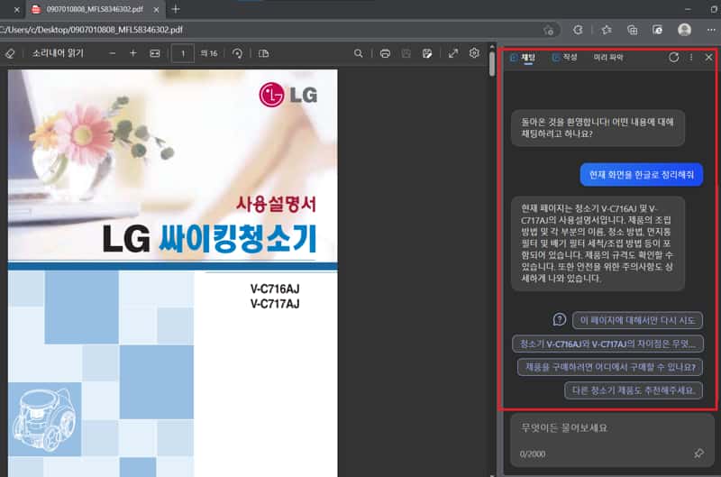 PDF 파일을 엣지 브라우저에 끌어놓고 '현재 화면을 정리해줘' 라고하면 페이지 갯수에 상관없이 요약 정리해줍니다.