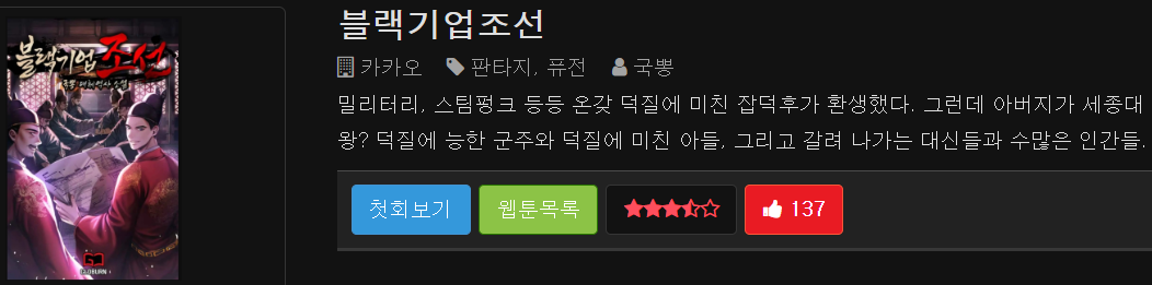 말도 많고 호불호도 갈리지만 대체역사물 중에서 원탑이란건 부정할 수 없는 사실. 긴 분량과 그걸 지루하지않게 엮은 필력이 받쳐줌. 질려서 다른거 보러가기도 했지만 다시찾게 되는 매력이 있음. 비슷한 대체역사물도 많지만 거의 그쪽계열 바이블이라고 봐도 무방할정도 작가의말이랍시고 가정사 적어놓는게 많아서 깨는건 있긴함 유일한 마이너스요소.