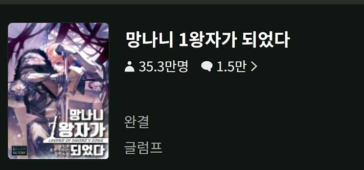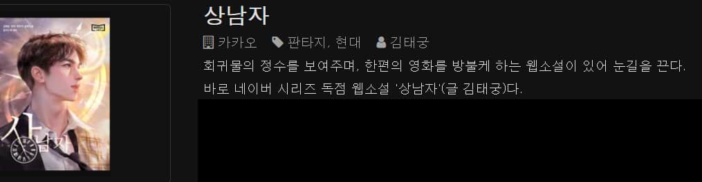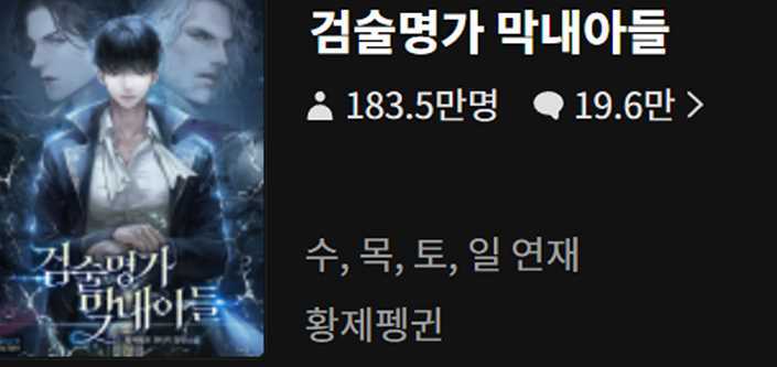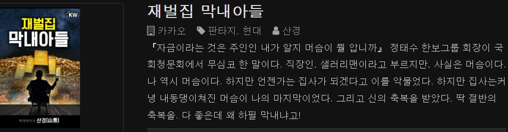 개인적으로 재벌집막내아들보다 재밌게 본 웹소설 상남자. 다만 후반부에 소재가 떨어진 건지 살짝 지루해짐. 돈에 초월한 줄 알았었는데 주식으로 푼돈 버는 거 보고 참.. 비트코인이 존재하지만 않았어도 더 재밌었을 소설입니다.