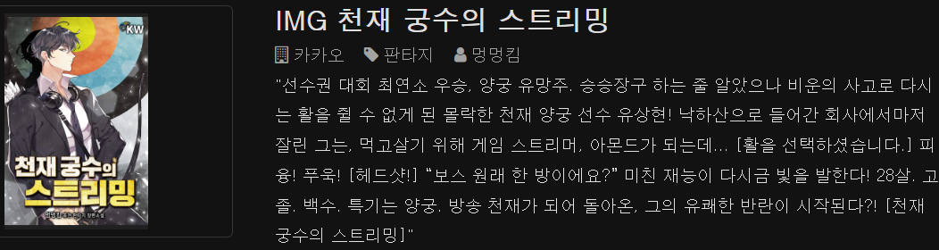 먼치킨물을 빙자한 등장인물들의 내면 성장물. 주인공이 국내 최연소 양궁 선수권 금메달딴 선수라 작중에서 활쏘는 실력은 세계 1등이라는 전제깔고 소설 진행함. 뭐든지 활로 해결하는 먼치킨물인데 먼치킨물은 그냥 소소재미고 내면 성장이 진국임. 이 소설의 진가는 사고로 국가대표를 포기할 수 밖에 없었던 청년이 캡슐이라는 새로운 수단으로 나이 30에 가상세계에서 10년넘게 못쏘던 활을 쏘게되면서 겪는 정신적 성장이 진짜 메인스토리임. 주인공이 겜 잘하는건 그냥 베이스고 그 과정에서 진행되는 스토리. 작가가 필력이 좋아서 글이 술술 읽히기 때문에 먼치킨 진행때는 술술 읽다가 주인공이랑 등장인물들 내면 표현할때는 집중해서 읽으면 맛도리임.