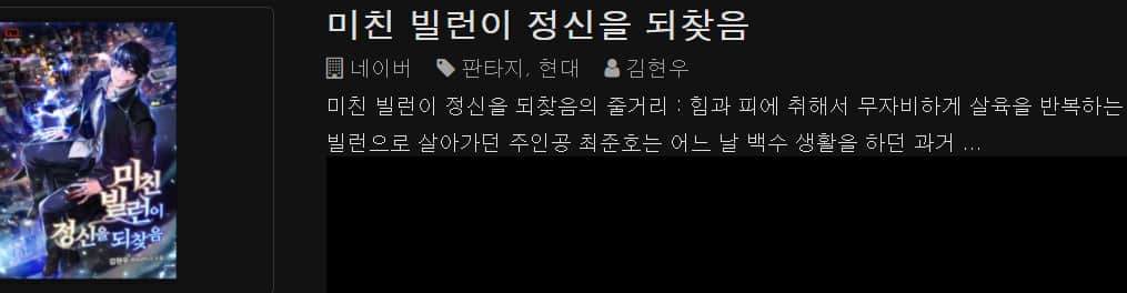시원시원한 사이다 전개로 호평을 받은 작품 미친 빌런이 정신을 되찾음. 주인공이 미친놈인데 그냥 다 때려뿌시고 다니면서 미친놈이 회귀해서 정신차렸다고 착각하는 미친놈 이야기라고 생각하면 됩니다. 가볍게 즐기기 좋은 사이다 먼치킨물입니다.