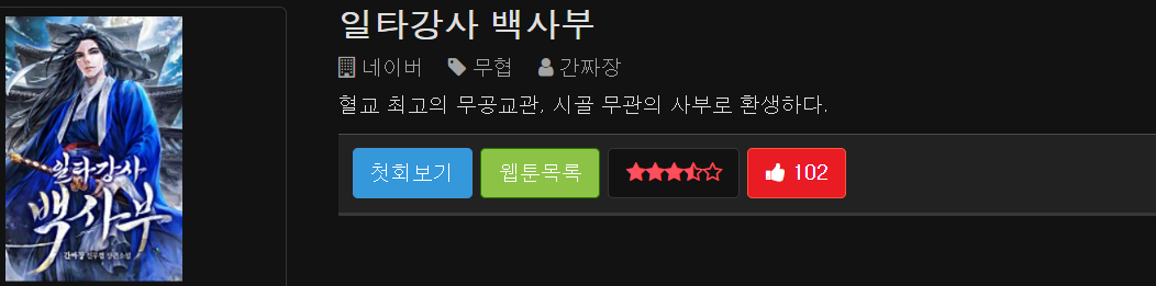 작품 자체는 성장물인데 무협중에서 입문하기 좋을듯 함. 기존에 딥하게 읽는 사람들은 싫어할 작품이고 "나 화산귀환 읽었는데 무협 더 보고싶다" 하면 백사부랑 이거보면 될듯함. "주인공이 짱짱쌔서 무쌍한다"라기 보다는 감정선에 좀 더 치우쳐져 있음. 반성하고 제2의 인생을 잘 살아보자 라는 느낌의 성장물 이라고 생각하면 될 듯. 전투 묘사도 잘 되어 있음. 이 작품은 인물의 생각을 나의 입장에서 생각해보고 곱씹어 보는 작품임. 자기성찰 좋아하는 사람한테는 추천하는 무협